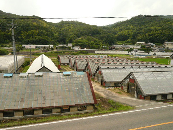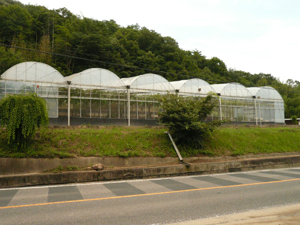 【直売所前のハウス】 昔はすべてガラスハウスでしたが最近はビニールハウスが主流。