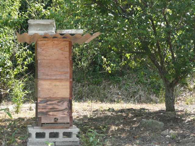 【巣箱】ハウスの周辺にいくつかの日本ミツバチの巣箱を設置しハチミツを採集しています。