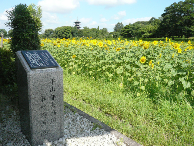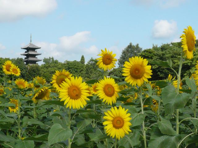 【ひまわり】取材ポイントから五重塔を遠くに望むひまわり畑。