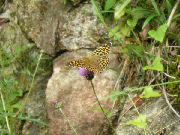 【あざみと蝶】 ハウスのそばに可憐なあざみの花が咲き、蝶が訪ねてきています。