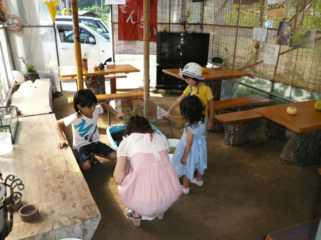 【めだか】休憩所の中にいるメダカを観察する親子。