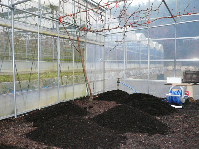 【土づくり】12月中には翌年のぶどう作りに欠かせない堆肥を撒きます。若い木でも一本あたり300㎏程度撒きます。