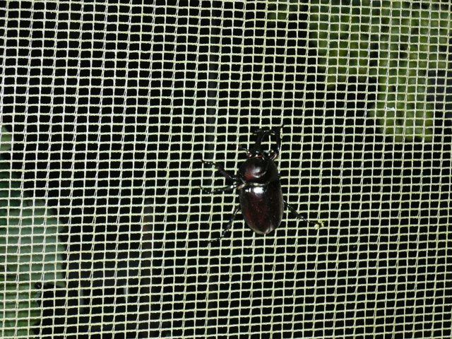 【カブトムシ】ぶどうの香りに引き寄せられたのか、カブトムシがハウスのネットに。