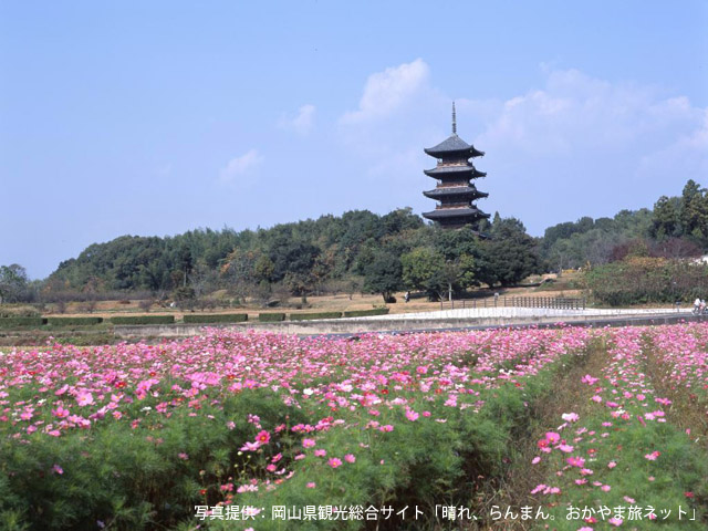 【備中国分寺】コスモスの中にたたずむ五重塔が、吉備路の象徴として有名です。当園から車で約30分。