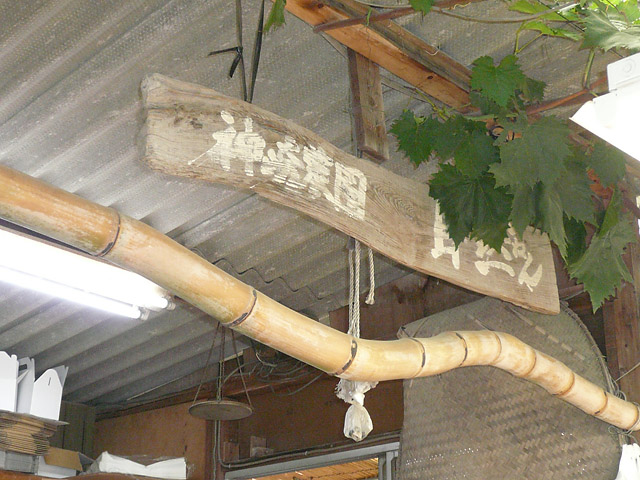 【看板】 昔からの自然木の看板です。竹の曲りも面白いです。